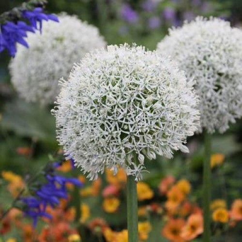Allium Mount Everest is a hardy perennial that grows up to 1.2m tall. Clusters of white, star-shaped flowers form tightly-packed balls, up to 12cm across appear onn tall, ribbed stems in late spring and early summer.