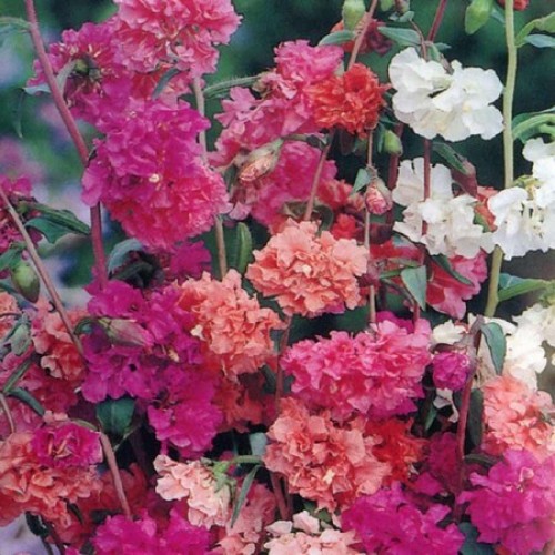 produces a mass of double flowers in various shades of Pink, Blue and