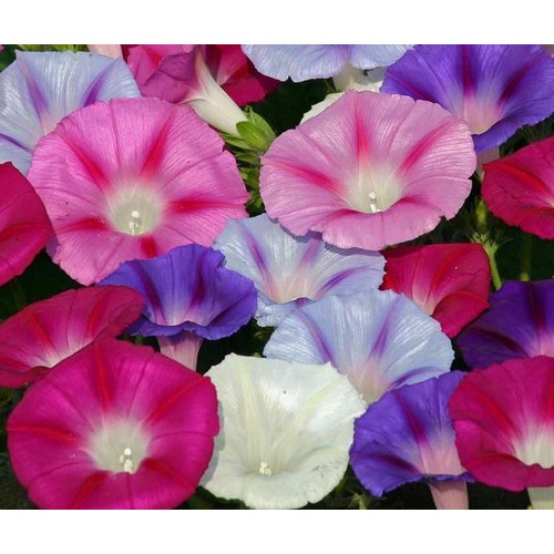 Ipomoea (Morning Glory) Flying Saucer Mix is a beautiful annual climber that grows to a height of 3m and produces striking 3-4 inch trumpet flowers in a range of colours including Pink, Blue, Purple and White, all with a coloured star stemming outwards from the throat of the flower. The flowers open fully in the morning only, hence the name. Flowers over the entire summer with very pretty flowers.